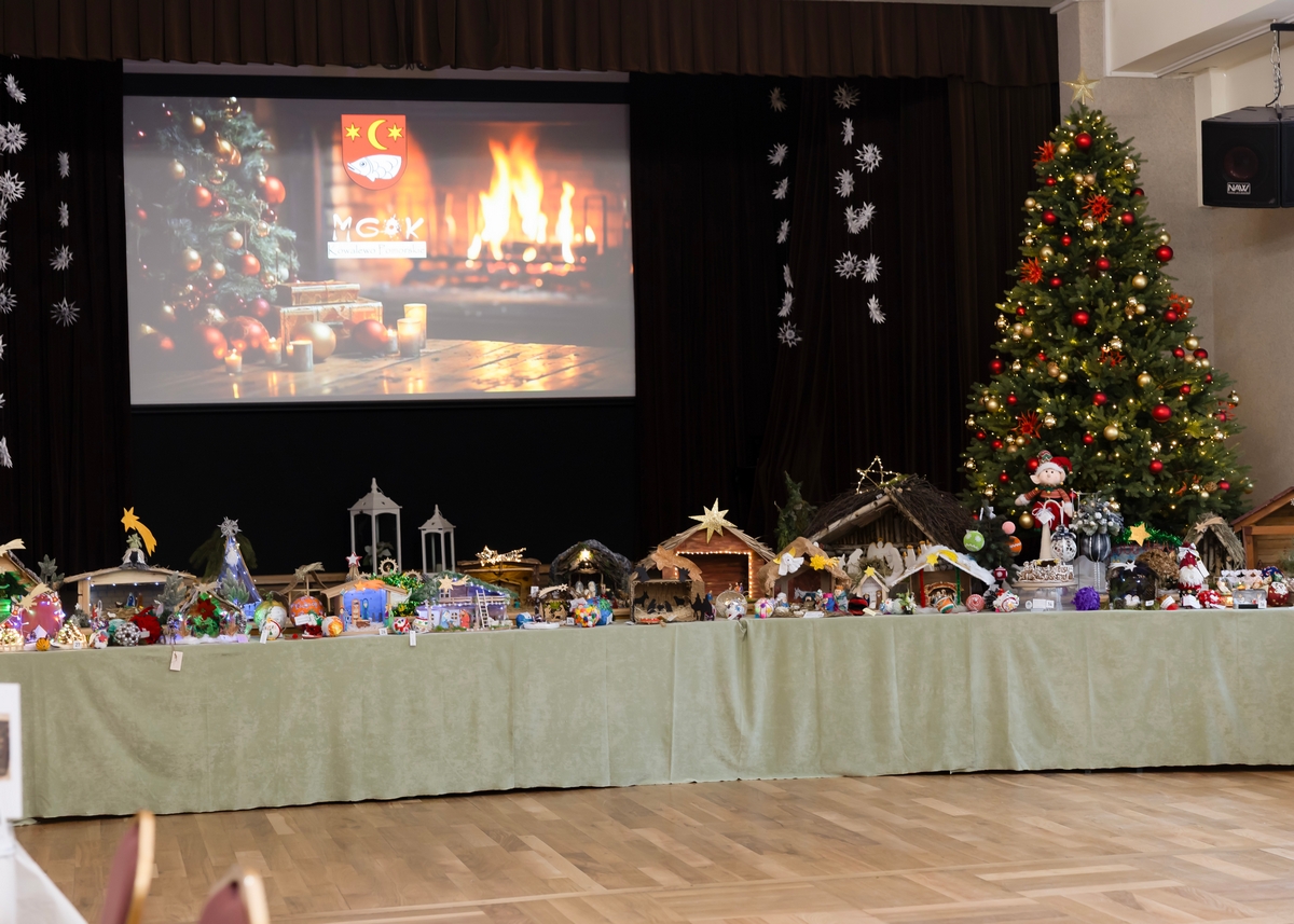 Na scenie sali widowiskowej Domu Kultury zostały zaprezentowane prace Mieszkańców biorących udział w konkursach bożonarodzeniowych organizowanych przez Dom Kultury: szopki bożonarodzeniowe oraz bombki choinkowe.