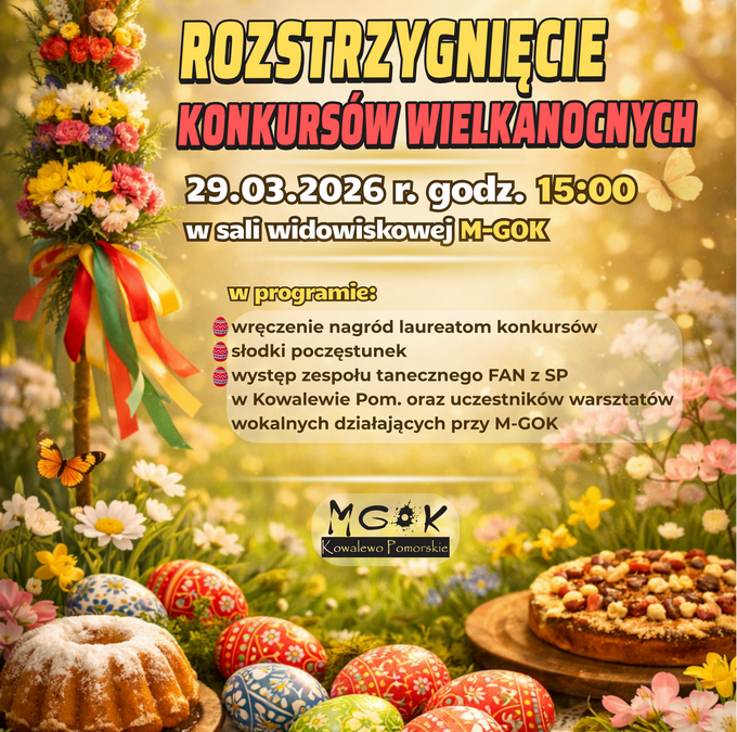 Rozstrzygnięcie KONKURSÓW WIELKANOCNYCH utworzone przez MGOK | mar 23, 2026 29.03.2026 r. godz. 15:00 w sali widowiskowej M-GOK